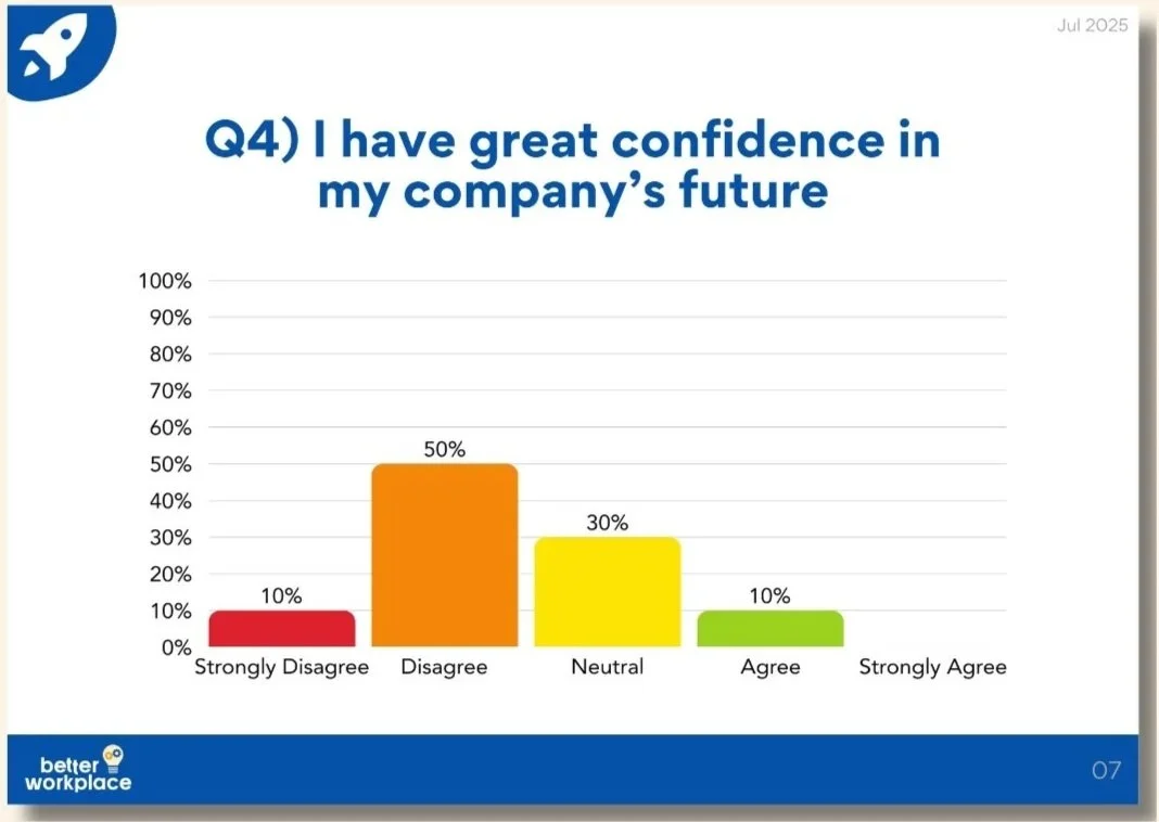 Unlike other companies, we don’t use really long ‘employee engagement’ surveys that consist of many meaningless questions and answers. Instead, we use a small number of proven questions that highlight risks that lead to declining productivity or employee turnover.